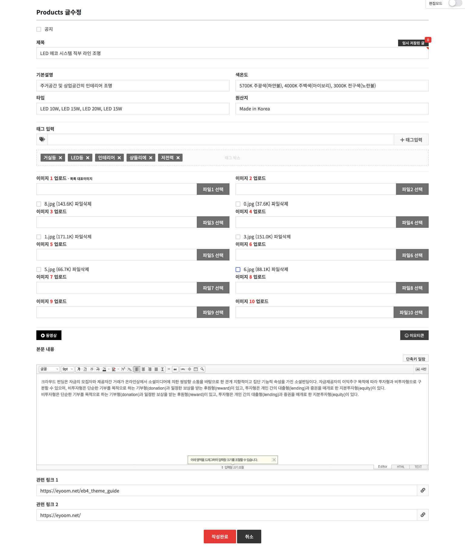 - · 첨부파일은 이미지 파일 등록하며 첫번째 이미지는 목록에서 출력됩니다.