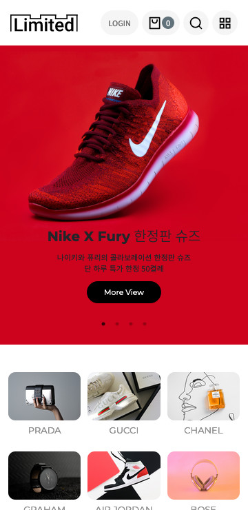 - 설치시 상품 등록은 지원하지 않기에 데모사이트와 같이 상품 출력 된 레이아웃은 출력되지 않습니다.(직접 관리자모드에서 상품 입력 해야합니다.)