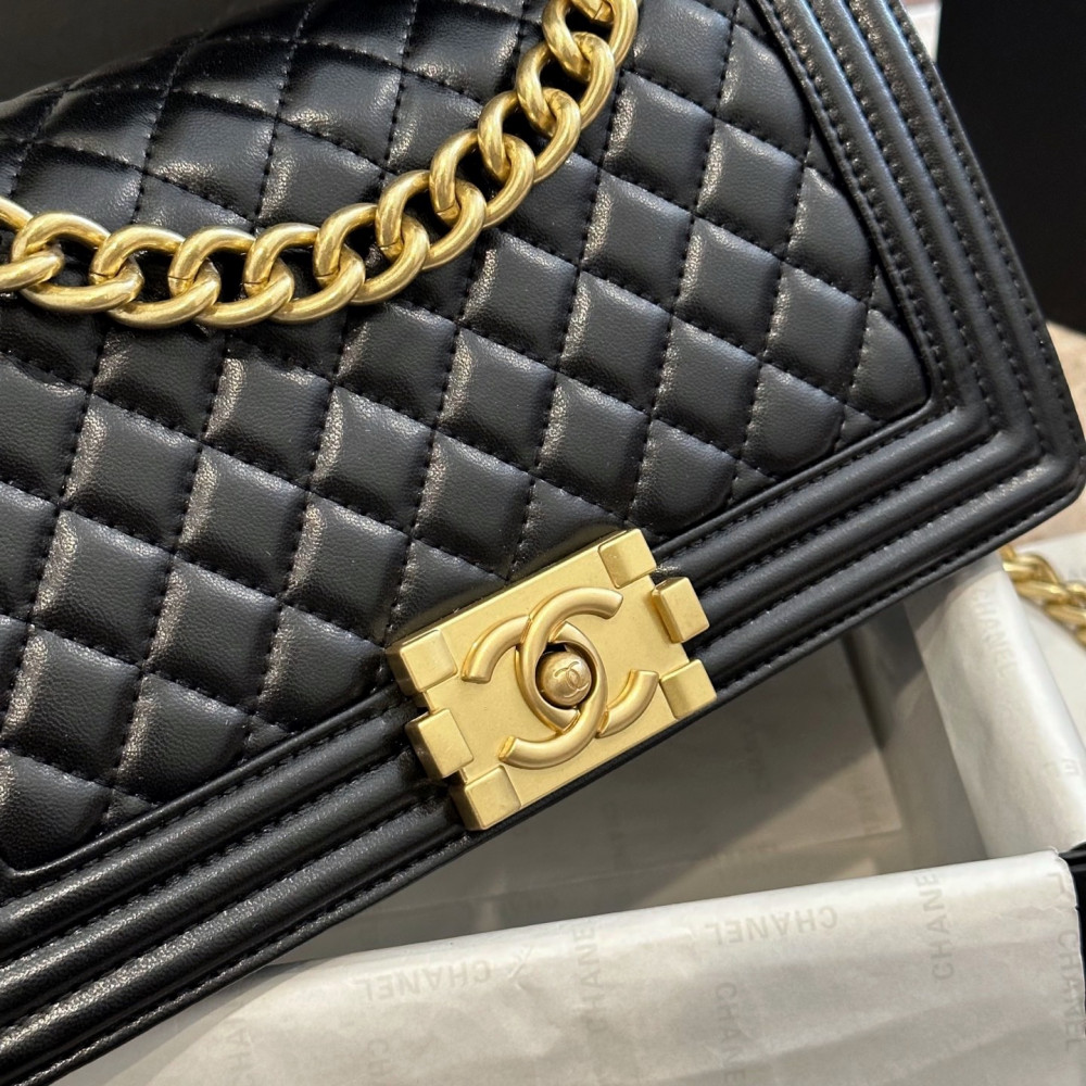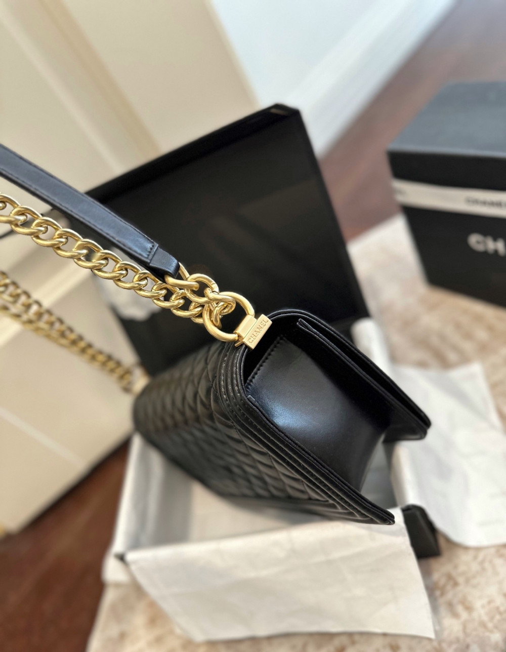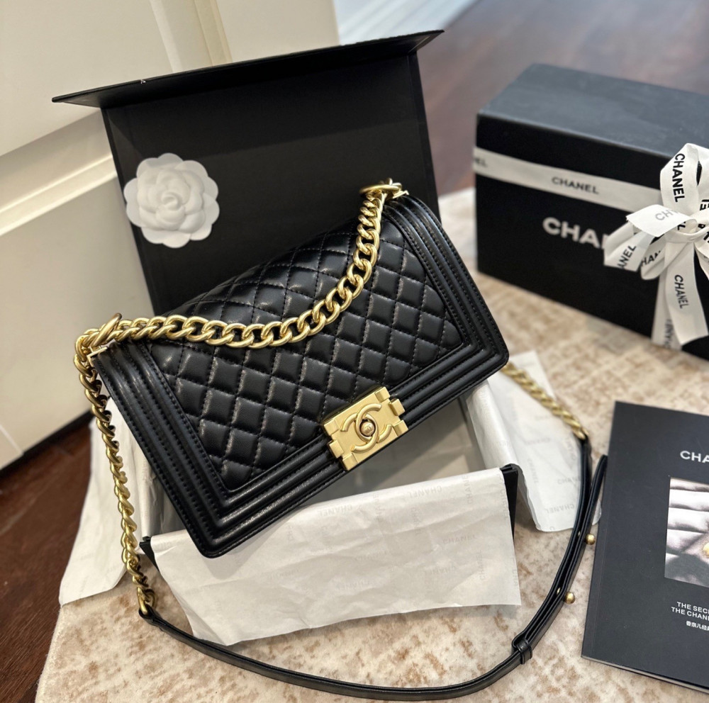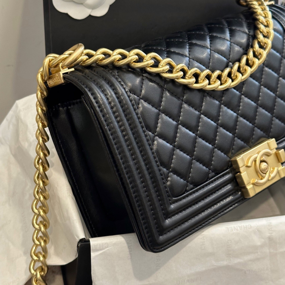 클래식 플랩(CF) 모델과 비교했을 때, 보이백은 더욱 강렬하고 구조적인 엣지가 돋보이는 제품입니다.