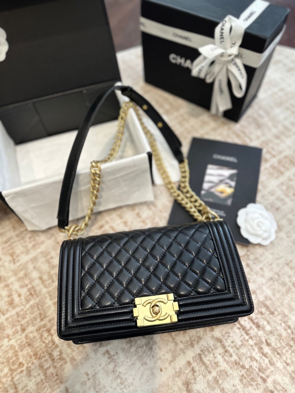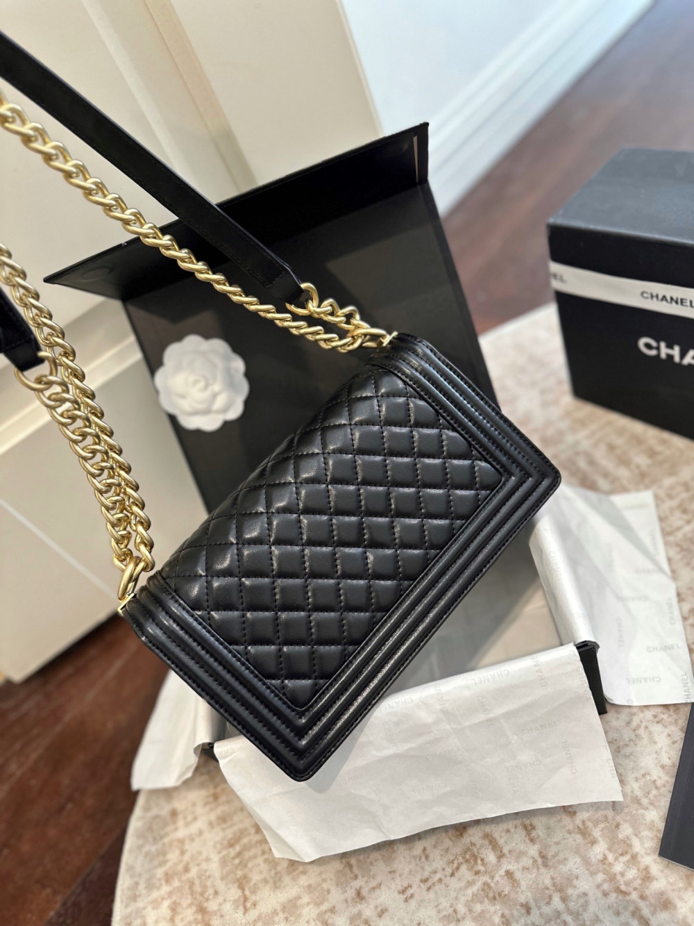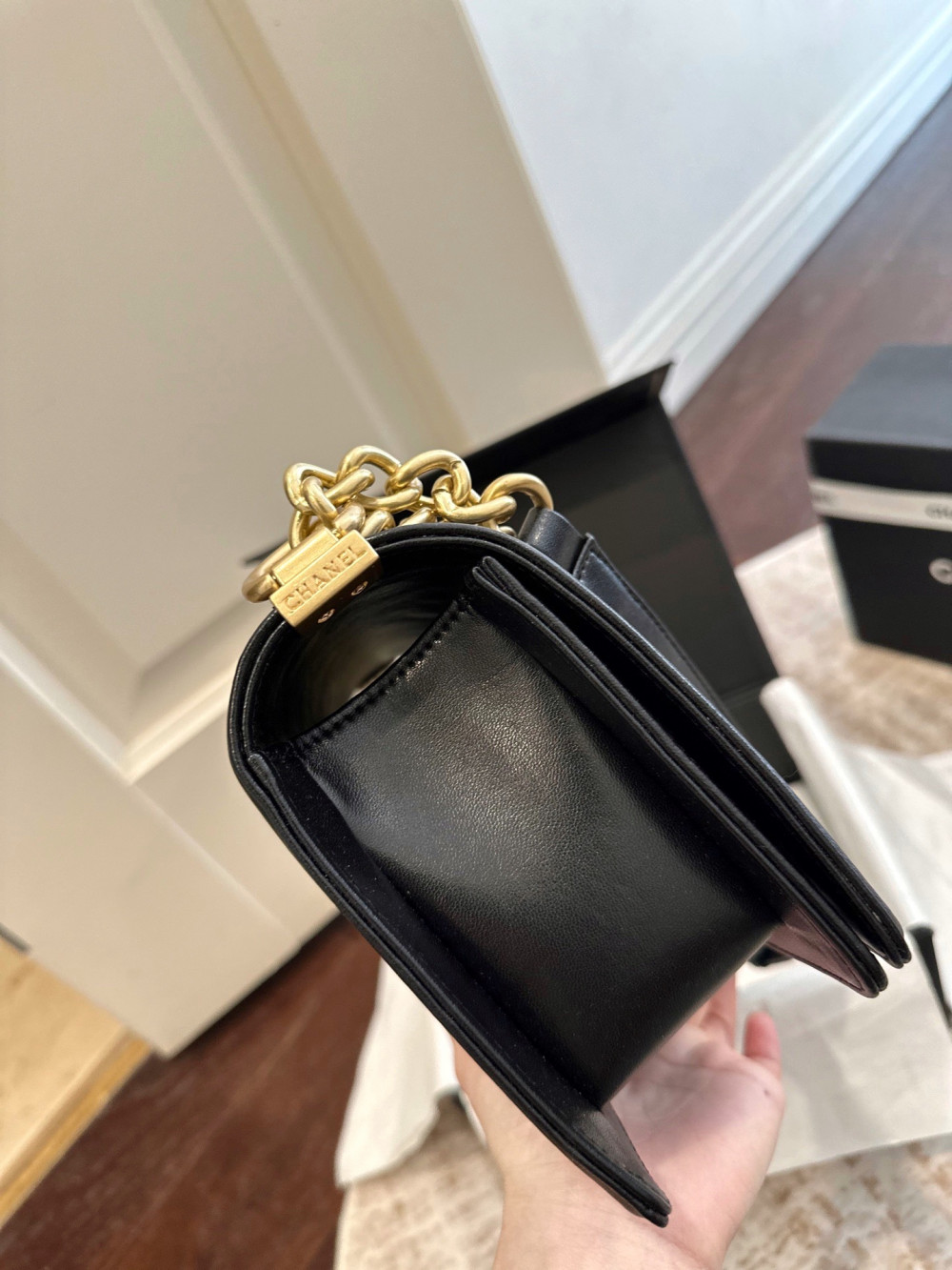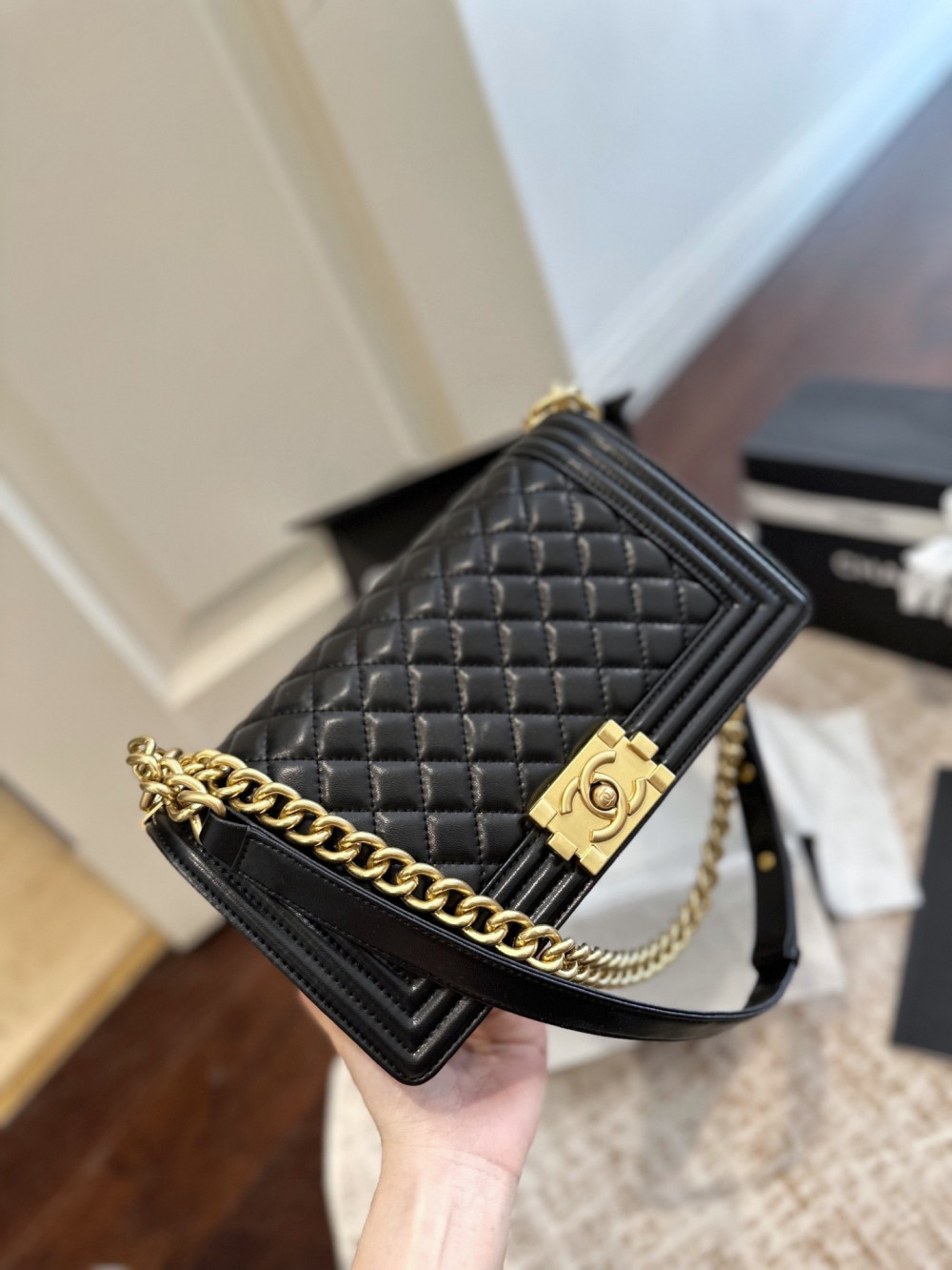클래식 플랩(CF) 모델과 비교했을 때, 보이백은 더욱 강렬하고 구조적인 엣지가 돋보이는 제품입니다.
