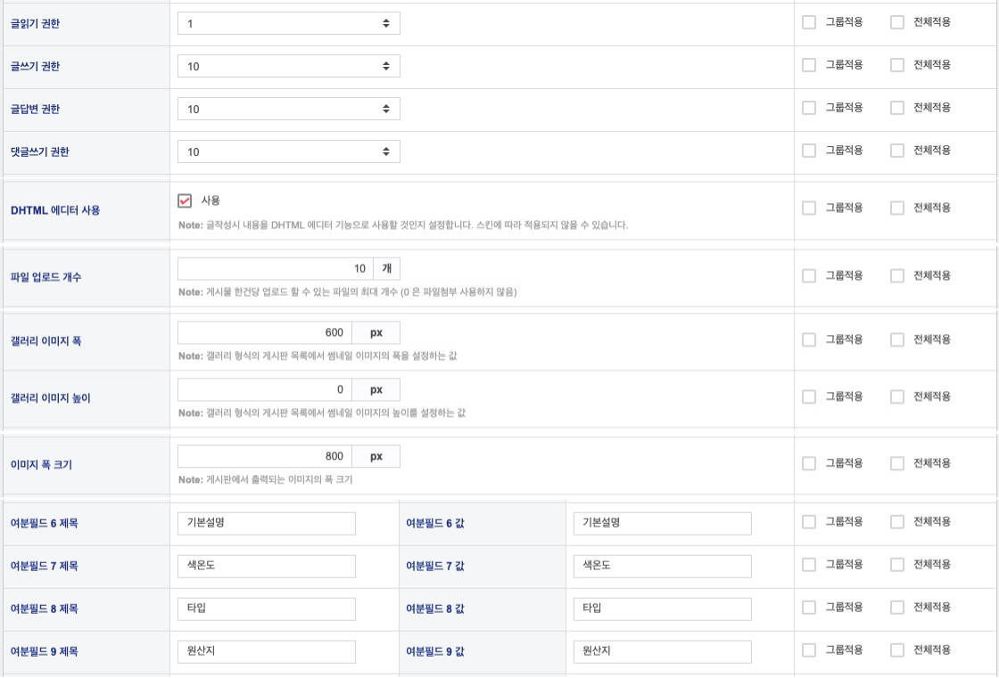 - · 관리자 외에 글쓰기, 답글, 댓글쓰기를 사용한다면 권한을 9이하로 설정합니다.