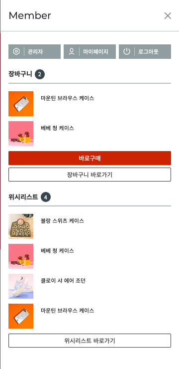 - · 로그인 후 아이콘 클릭시 창으로 오늘본상품, 장바구니, 위시리스트를 확인 할 수 있습니다.