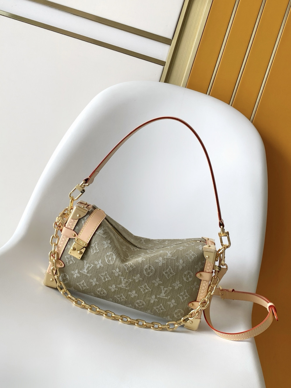 - 소 재:고품질 올드핑크/베이지 모노그램 데님 원단 (내마모성 & 질감 풍부) + 부드러운 네추럴 가죽 트림 (바디/손잡이) + 빛나는 골드톤 금속장식 (클립/체인)
