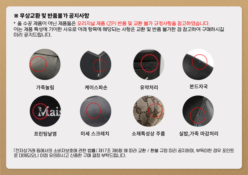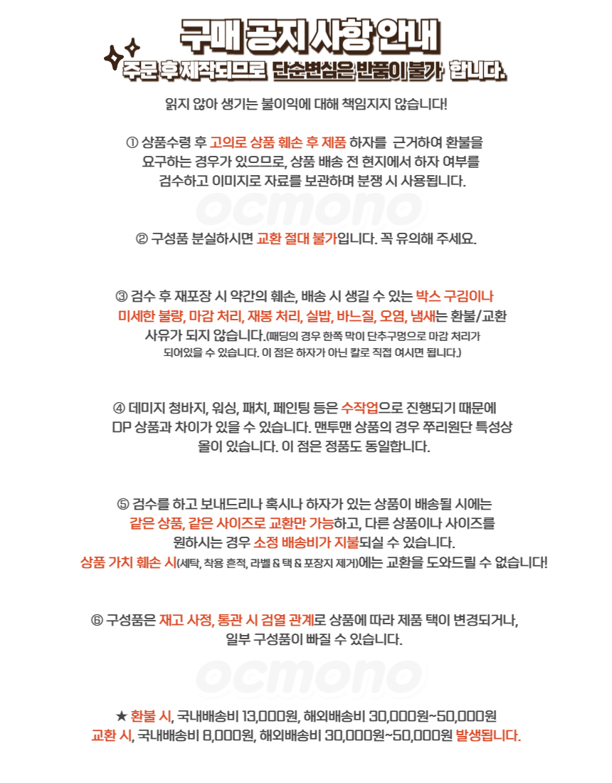 검수 후 재 포장시 약간의 훼손 , 배송시 생길 수 있는 박스구김이나 미세한 불량, 마감처리,오염,냄새 등은 환불,교환 사유가 되지 않습니다.